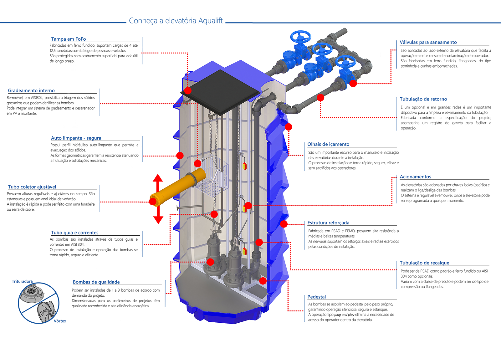 O correto dimensionamento e a instalação adequada de uma estação elevatória são etapas fundamentais para garantir eficiência, segurança e durabilidade no bombeamento de esgoto. As elevatórias compactas da linha Aqualift foram desenvolvidas para solucionar problemas de soleira negativa, situação em que o esgoto está em um nível mais baixo que a rede coletora pública e precisa ser bombeado até ela. Esses sistemas permitem conectar residências, condomínios e empreendimentos à rede de saneamento de forma eficiente, evitando contaminação do solo e contribuindo para a saúde pública. O primeiro passo para dimensionar corretamente uma elevatória é avaliar o número de usuários atendidos pelo sistema. A quantidade de residências ou pessoas conectadas determina o volume de efluente gerado diariamente e, consequentemente, a capacidade necessária do equipamento. Na linha Aqualift existem diferentes modelos para cada aplicação: sistemas menores podem atender uma única residência, enquanto modelos maiores podem atender dezenas ou até centenas de casas, dependendo da vazão e da altura de bombeamento exigida pelo projeto. Outro fator essencial no dimensionamento é a profundidade do tubo coletor. Essa informação define a posição de instalação da elevatória e influencia diretamente na altura manométrica que a bomba deverá vencer para enviar o esgoto até a rede pública. Quanto maior o desnível entre a elevatória e o ponto de descarte, maior será a potência ou capacidade necessária do sistema de bombeamento para garantir o funcionamento adequado. Durante o processo de instalação, é fundamental preparar corretamente a área onde a elevatória será posicionada. Os manuais indicam que deve ser reservada uma área específica para a instalação e realizada uma escavação com dimensões adequadas ao modelo da elevatória. Após a escavação, recomenda-se aplicar uma camada de aproximadamente 5 cm de pedra brita no fundo da base para garantir o nivelamento e o assentamento correto do equipamento. Outro componente importante do sistema é a caixa de gradeamento, responsável por reter sólidos maiores antes que eles cheguem à bomba. Esse pré-tratamento evita entupimentos e protege o conjunto de bombeamento contra danos mecânicos, aumentando a confiabilidade do sistema e reduzindo a necessidade de manutenção. Após o posicionamento da elevatória, é necessário realizar a compactação adequada do solo ao redor do equipamento. Esse processo garante estabilidade estrutural e evita deslocamentos ou deformações ao longo do tempo. A compactação correta também contribui para manter o sistema estanque, evitando infiltrações e protegendo o solo contra contaminação. Por fim, antes de colocar a elevatória em operação, deve-se verificar a tensão da rede elétrica e a compatibilidade com o sistema de bombeamento instalado. As elevatórias Aquastar utilizam bombas submersíveis com acionamento automático, que podem operar com diferentes sistemas de controle de nível, como chave-boia, sensores hidrostáticos ou sensores ultrassônicos, garantindo funcionamento eficiente e automatizado do ciclo de bombeamento.